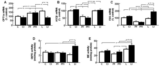 CPT1a mRNA levels were augmented in the PF and L groups and insulin decreased these levels only in L (Figure 3A; interaction leptin and insulin: F = 4.41, p < 0.05). Relative mRNA content of ACCβ and FAS were reduced in the PF groups (Figure 3B,C, respectively). There was no effect of insulin on ACCβ in any group (Figure 3B), whereas mRNA levels of FAS increased after an insulin bolus in L rats (Figure 3C; interaction leptin and insulin: F = 8.59, p < 0.01). The activity of G6PD was augmented after a bolus of insulin in L rats (Figure 3D; interaction leptin and insulin: F = 17.63, p < 0.001). When ME activity was analyzed, it was found to be increased in rats treated with leptin plus insulin (Figure 3E).