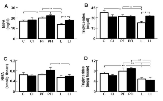 Whole body weight and body weight gain were reduced in both PF and L, with these reductions being greater in L. Liver and soleus content showed no differences among the experimental groups and the gastrocnemius weight presented an increase in L only with respect to the PF group. Percentage of epididymal, inguinal and mesenteric depot masses were decreased in both PF and L, with this reduction being greater in L in the epididymal and inguinal fat pads. Percentage of retroperitoneal fat mass was diminished in the L group and interscapular brown adipose tissue mass was reduced in PF rats (Table 1).