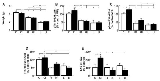 Changes in subcutaneous adipose tissue. (A) Weight in control rats (C); rats receiving acute central administration of insulin (CI); pair-fed rats (PF); pair-fed rats treated with insulin (PFI); rats treated with chronic icv leptin infusion (L) and rats treated with leptin plus insulin (LI). (B) Relative phosphorylated (p) Akt on theonine 308 (pThr308Akt) protein levels. (C) Relative phosphorylated Akt on serine 473 (pSer473Akt) protein levels. (D) Relative phosphorylated S6 kinase on threonine 389 (pThr389S6K) protein levels. (E) Relative fatty acid synthase (FAS) mRNA levels. Values are means ± SEM. n = 5. MFI, median fluorescent intensity. * p < 0.05, ** p < 0.01.