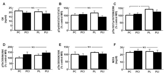 3.3. Hepatic GH Signaling is Increased after Insulin Infusion in Leptin-Treated Rats