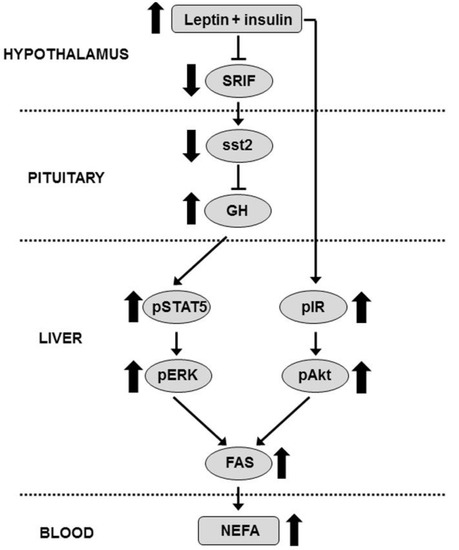 Our data indicate that the reduction in serum lipid levels after chronic leptin infusion is associated with changes in hepatic lipid metabolism. As summarized in Figure 7, our findings support the notion that central inhibition of SRIF action in leptin plus insulin-treated rats may be involved in the increase in GH levels and could increase lipid anabolism by potentiating hepatic insulin and GH sensitivity. These results suggest that changes in brain leptin and insulin signaling could modify the peripheral lipid profile through modulation of hepatic metabolism.