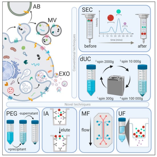 Extracellular vesicles (EVs) biogenesis and methods of isolation of exosomes. AB: Apoptotic bodies, microvesicles (MV), exosomes (EXO), size-exclusion chromatography (SEC) and differential ultracentrifugation (dUC), Poly-ethylene glycol (PEG), Microfluidics (MF) and Ultrafiltration (UF). Adapted under the terms and conditions of the Creative Commons Attribution (CC BY) license (http://creativecommons.org/licenses/by/4.0/) (accessed on 2 March 2021) [15].