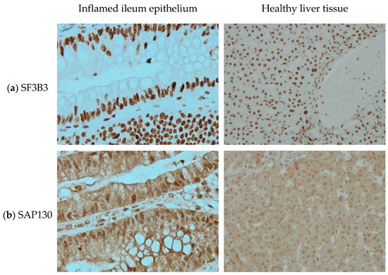 Immunohistochemistry staining of (a) splicing factor 3b subunit 3 (SF3B3) and (b) Sin3A associated protein 130 (SAP130) in (left) inflamed ileum epithelium, imaged at 40× magnification and (right) healthy liver tissue, imaged at 20× magnification.