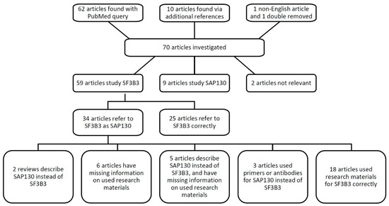 Literature review. We performed a literature review in PubMed to retrieve all articles describing SAP130 or SF3B3 with the query: (SF3B3[All Fields] OR SAP130[All Fields] OR “spliceosome associated protein 130”[All Fields] OR “splicing factor 3b subunit 3”[All Fields] OR Sin3A associated protein 130), on 29 April 2020. We last updated the query results on 20 January 2021. Relevant articles we came across during the review were included. We selected both articles and reviews that were written in English. For each paper, we carefully checked the use of the gene or protein name and abbreviation, references to earlier research, and the materials and methods section (e.g., primer sequences and antibody ascension numbers).