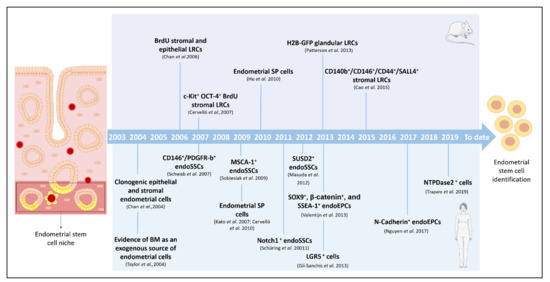 Milestones in the identification, isolation, and characterization of endometrial stem cells. Timeline of the principal findings concerning endometrial stem cells and specific isolation techniques in murine and human models. BM: bone marrow; BrdU: bromodeoxyuridine; CD: cluster of differentiation; endoSSCs: endometrial stromal stem cells; endoEPCs: endometrial epithelial progenitor cells; GFP: green fluorescent protein; H2B: histone 2B; LRCs: label-retaining cells; LGR: leucine-rich repeat containing G-protein-coupled receptor; MenSCs: menstrual blood stem cells; NTPDase2: ectonucleoside triphosphate diphosphohydrolase-2; SSEA-1: stage-specific embryonic antigen-1; SP: side population; SUSD2: sushi domain-containing-2.
