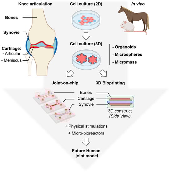 Overview of the biological models commonly used: (top) animals, 2D and 3D cell cultures and (bottom) emerging: joint-on-a-chip and 3D bioprinting to study human articulation and its related diseases. Organoids are complex clusters of organ-specific cells, microspheres refer to shape-specific, macroporous scaffolds seeded with cells and micromass corresponds to high-density 3D cell cultures with multilayered organization. Top left, a schematic representation of the whole knee articulation, bones are in light brown, synovial cavity in light blue, articular cartilage in red and meniscus in orange, this color code was used for all the figures. Parts of the figure were created using biorender.com.