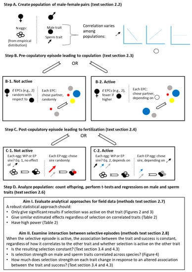 Schematic representation of simulation procedure and explanation of aims. Males (or the eggs they fertilize) are represented by unique colors. The male trait is indicated by a circle of varying size and the sperm trait by an arrow of varying length and width. The circle and arrow are dashed when they do not indicate specific individuals. Populations had either only pre-copulatory selection active (Steps B-2 and C-1), only post-copulatory selection active (Steps B-1 and C-2), or both episodes active (Steps B-2 and C-2). For each of these combinations, varying correlations between the male trait and sperm trait were tested. The female was assigned a number of extra-pair copulations (EPCs), E, by drawing from a Poisson distribution with species-specific mean m; E did (B-2) or did not (B-1) depend on the within-pair male’s male trait. From the available extra-pair males (four shown here, for illustration), E actual copulation partners were drawn, randomly (B-1) or depending on the extra-pair male’s male trait (B-2). The probability that each egg was fertilized by extra-pair sperm was calculated, either depending only on E and a species-specific term s (C-1, Equation (1)), or depending on E, s, and the relative sperm quality of the within-pair male and extra-pair copulation partners (C-2, Equation (2)). For extra-pair eggs, the sire was assigned from among the extra-pair copulation partners either randomly (C-1) or depending on their sperm trait (C-2). Illustrations of available sperm for population C-1 are from step B-1, and for C-2 from B-2. Aims are explained, with reference to methods sections and results text, figures and/or tables.