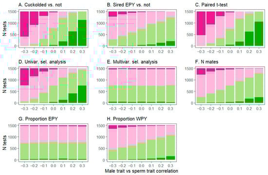 Spurious significant results for sperm traits (i.e., detected selection in individual populations where the sperm trait did not affect fertilization success) were common for most analytical approaches when the sperm trait correlated to a male trait under selection. Pink colors indicate estimated negative selection and green colors indicate positive selection; intense colors are significant test results, while lighter colors are non-significant. Analytical approaches were (A): unpaired t-tests of males that lost paternity within their own broods (were cuckolded) or did not; (B): unpaired t-tests of males that gained extra-pair young (EPY) in other broods or did not; (C): paired comparisons of extra-pair sires to the within-pair males that they cuckolded; (D): univariate selection analysis regressing offspring sired on the sperm trait; (E): multivariate selection analysis regressing offspring sired on both traits (with test results shown for the sperm trait only); (F) regression of the sperm trait on the number of detected extra-pair copulation partners; (G) regression of proportion of extra-pair brood sired on the sperm trait of extra-pair males, including only broods where the male sired at least one extra-pair young; and (H): regression of the proportion of within-pair young (WPY) on the sperm trait of the within-pair male, including only broods where the male lost paternity. Type 1 error is expected to produce only 5% (75) significant tests per column.