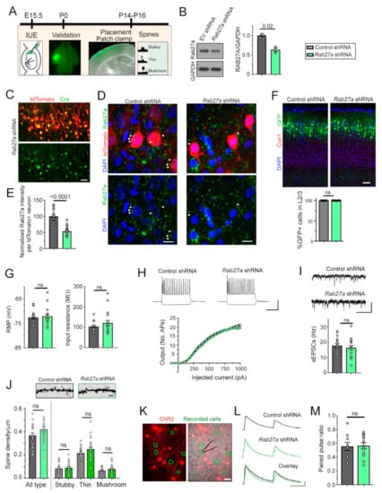 To examine the function of Rab27a on the development of cortical neurons, we decreased Rab27a levels using a knockdown strategy in vivo with in utero electroporation (IUE, Figure 1A). We first tested the knockdown efficiency of shRNA vectors (conditional pSico [31] co-expressed with pCAG-Cre) against Rab27a in cultured cortical neurons. Three days following nucleofection of cultured neurons, Rab27a shRNA significantly decreased Rab27a levels compared to a control empty vector (Figure 1B). In addition, we found no compensatory increase in Rab27b in the Rab27a shRNA condition (Supplementary Figure S1). We then used IUE to express conditional Rab27a shRNA plasmid or an empty vector control in radial glia at embryonic day (E) 15–15.5, targeting late-born pyramidal neurons that populate layer (L) 2/3 in the somatosensory cortex. In both conditions, we co-electroporated an inducible GFP plasmid and a vector encoding Cre recombinase (Cre) under the neuronal promoter doublecortin (Dcx) to induce recombination selectively in developing neurons, but not in radial glia [26]. Immunostaining for Cre showed that nearly all electroporated cells displayed Cre expression (Figure 1C). We also immuno-stained for Rab27a in both control and Rab27a shRNA conditions (Figure 1D). Analysis of Rab27a fluorescence per cell or Rab27a puncta size revealed a significant decrease (47%) of Rab27a expression in the Rab27a shRNA condition (Figure 1E). Decreased Rab27a expression did not alter the placement of L2/3 pyramidal neurons (Figure 1F). Whole-cell patch-clamp recordings of electroporated neurons revealed that Rab27a shRNA did not alter their resting membrane potential, input resistance, and intrinsic excitability (Figure 1G,H). In addition, the frequency of spontaneous excitatory postsynaptic currents (sEPSCs) was not altered by Rab27a knockdown (Figure 1I). Since dendritic spines are the unitary sites of excitatory synaptic inputs, we examined their density. Consistent with the sEPSC data, knocking down Rab27a did not alter the density and shape distribution of spines in electroporated neurons (Figure 1J). Considering that Rab27 regulates synaptic release in C. elegans and squid [10,11], we examined whether Rab27a shRNA would affect synaptic vesicular release from cortical neurons in vitro. We co-electroporated channelrhodopsin (ChR2) with the shRNA and induced action potentials followed by vesicular release from neurons expressing Rab27a shRNA. Using patch-clamp recordings of neighboring non-electroporated neurons in the same cultures (Figure 1K), we found that Rab27a shRNA did not affect paired pulse ratio, a read-out of release probability (Figure 1L,M). Collectively, these data suggest that decreasing Rab27a levels in cortical neurons did not affect their migration, spine development, and synaptic connectivity in a cell-autonomous manner.