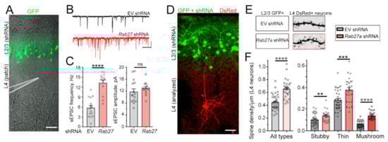 Considering Rab27a’s role in vesicular trafficking, including the fusion of MVB resulting in the release of intraluminal vesicles (ILs) into the extracellular space that are then called sEV or exosomes [15,16,17,18,19,20,21], we investigated whether synaptic and biophysical properties of non-electroporated neurons nearby Rab27a shRNA-expressing neurons were altered. We examined L4 neurons because these neurons are born earlier than L2/3 neurons and as such, late-born neurons destined for L2/3 neurons migrate through deep cortical layers containing L4 neurons to reach their final location. In addition, the dendritic trees of L2/3 and L4 pyramidal neurons overlap during the neonatal period, and their axons travelled through each other’s dendritic tree and soma territories [32]. In addition, L4 neurons do not receive synaptic inputs from L2/3 neurons [33]. Patch-clamp recordings were obtained at P14 to examine potential changes in neuronal biophysical properties and synaptic inputs (Figure 2A). At this developmental age (P14), cortical pyramidal neurons are still acquiring dendritic spines (Supplementary Figure S2). Decreasing Rab27a levels in L2/3 neurons had no effect on the resting membrane potential, membrane resistance, and intrinsic excitability of L4 neurons (data not shown). However, it led to a significant increase in the frequency of sEPSCs in nearby L4 neurons without affecting their amplitude (Figure 2B,C). To evaluate spine properties, we used a dual IUE approach to conditionally express Rab27a shRNA in L2/3 neurons (E15.5 IUE) and DsRed in L4 neurons in the same animal using an inducible vector and Dcx-Cre (E13.5 IUE, Figure 2D). Expressing Rab27a shRNA in L2/3 neurons significantly increased spine density in L4 neurons, including the density of mushroom spines, which are considered mature and stable spines (Figure 2E,F).