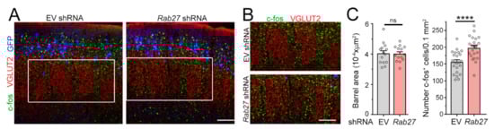 We next speculated that an increased number of excitatory synaptic inputs onto L4 neurons would lead to enhanced sensory responses upon whisker stimulation. L4 neurons in the somatosensory barrel cortex receive sensory information transmitted from the whiskers to the thalamus and provide a well-defined system to measure cellular responses to sensory inputs [34]. To test this, we placed P21 mice in an enriched environment to increase whisker stimulation and examined the number of L4 neurons immuno-positive for the immediate early gene c-Fos, a well-established read-out of neuronal activity [35] (Figure 3A,B). We found that reducing Rab27a expression in L2/3 neurons did not affect the anatomy of the barrels, but it led to a significant increase in the number of c-Fos-positive L4 neurons in the barrel cortex following whisker stimulation (Figure 3C). Collectively, these data indicate that decreasing Rab27a levels had a non-cell autonomous effect on surrounding cortical neurons.