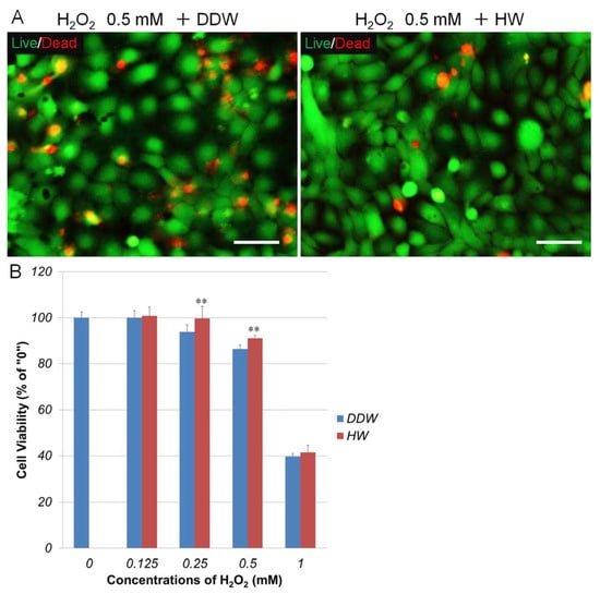 Repressive effects of HW on hydrogen peroxide-induced cell death in human keratinocytes HaCaT. HaCaT cells were pretreated with double-distilled water (DDW)- or HW-prepared medium for 2 h. Cells were then exposed to H2O2 at different concentrations. After 48 h, cell viability was measured by PrestoBlue Assay. (A) HaCaT cells were stained by Live/Dead staining. Green, live cells; red, dead cells. Scale bar = 50 µm (B) results of PrestoBlue Assay. ** p < 0.01 vs. 0 (without H2O2 treatment). Each bar represents the mean ± SD of three independent experiments.