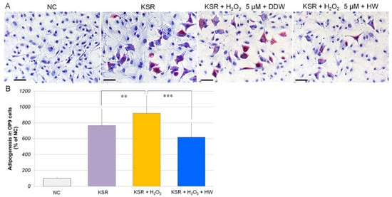 In our previous study, we demonstrated that H2O2 at a low concentration (5 µM) could stimulate adipogenesis in 3T3-L1 preadipocytes [20]. In this study, we found that H2O2 (5 µM) also significantly increased adipogenesis to 120% in KSR-differentiated OP9 adipocytes (Figure 4). Figure 4A shows that after being cultivated in KSR medium for 4 days, OP9 cells accumulated lipid droplets, especially in H2O2-treated cells. However, when OP9 cells were cultivated in HW-prepared KSR medium, the lipid accumulation significantly reduced.