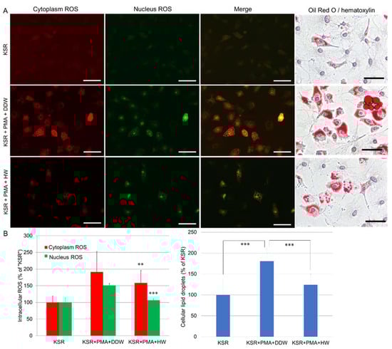 PMA was used as a NADPH oxidase activator, which induces endogenous superoxide anion and hydrogen peroxide in macrophages [25]. PMA also induces ROS generation and oxidative stress in human leukemia cell lines: THP-1 and U937 cells [26,27]. Both THP-1 and U937 cells can be differentiated into macrophage-like cells after being treated with PMA [28,29]. In this study, we demonstrated for the first time that PMA could increase lipid accumulation in KSR-differentiated OP9 cells. As shown in Figure 6, after being cultivated in KSR medium with PMA (10 ng/mL) for 4 days, cellular lipid droplets increased by 180% compared with the cells treated with KSR alone. At the same time, the ROS level of both cytoplasm and nuclei in OP9 cells was also markedly increased. When OP9 cells were cultivated in HW-prepared KSR medium with PMA for 4 days, cellular lipid droplets, nuclei, and cytoplasm ROS were significantly reduced, suggesting that HW was able to inhibit PMA-induced intracellular ROS and lipid accumulation.