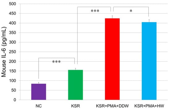 Repressive effects of HW on PMA-increased IL-6 secretion in OP9 adipocytes. OP9 preadipocytes (30,000 cells/well) were seeded into 24-well plates and grew to 100% confluence in the maintenance medium. Cells were then cultivated in DDW- or HW-prepared KSR medium with or without PMA of 10 ng/mL for 4 days. The NC cells were cultivated in the maintenance medium. At the end of cultivation, concentrations of IL-6 in cell culture supernatant were measured by ELISA as described in Materials and Methods. * p < 0.05; *** p < 0.001. Each bar represents the mean ± SD of three independent experiments.