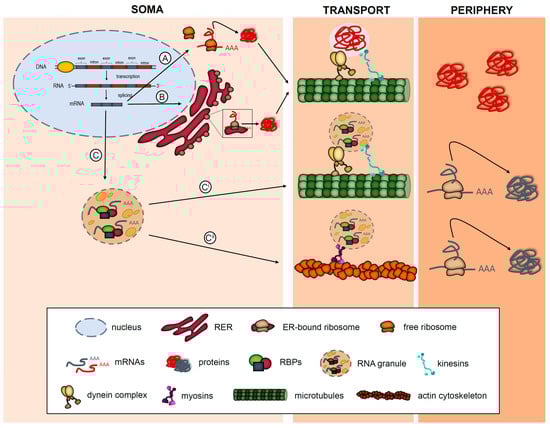 Protein synthesis is an essential process for cellular homeostasis. The classical view is that most RNAs in eukaryotic cells are translated within the soma, either in cytosolic free ribosomes or in rough endoplasmic reticulum (RER)-bound ribosomes. Once the proteins are generated and become mature, many of them are targeted to different subcellular compartments where they elicit their function []. An accurate targeting of the subcellular proteome is especially relevant in highly polarized, morphologically complex cells where proteins need to be asymmetrically sorted in order to establish distinct structural and functional domains. Subcellular protein distribution is typically achieved by localization signals within the protein sequence (Figure 1A,B). However, protein delivery to distinct cellular compartments can rely, not only on the transport of the protein itself but also on the transport of the mRNA that is then translated at target sites (Figure 1C). Although once considered heretical, mechanisms of localizing RNAs have proven to be highly prevalent and conserved in eukaryotes []. Additionally, translation of localized mRNAs, also known as local protein synthesis, is increasingly being recognized as a crucial mechanism that contributes to the physiology of the nervous system (NS) [].