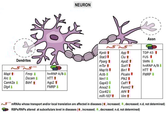 Neurite-localized transcripts and RBPs affected in pathological conditions. Note that some mRNAs and RBPs depicted differ between dendrites and axons. 1 Indicates miR-83 which is not an mRNA but a microRNA, yet it is localized to axons and regulates local protein synthesis []. Arrows indicate altered levels (red, increase; green, decrease) of mRNAs and/or proteins in diseases.