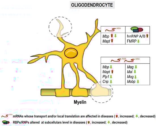 Given that many myelin components are transported in specialized RNA granules where RBPs and the microtubule network play critical roles impaired RNA processing, transport failure and/or aggregation of RBPs could affect local translation and even lead to ectopic expression of myelin proteins. Although very little evidence has been published in this regard, we will list below possible links between impaired RNA localization and/or local translation in oligodendrocytes and neurological /neurodegenerative disorders.