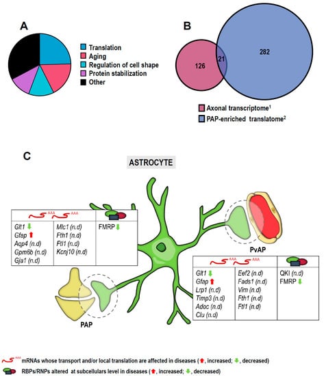 Deregulation of the interaction between astrocytes and neurons and astrocytes and the vascular system leads to the development and progression of many neurological and neurodegenerative diseases as previously reviewed [,]. Additionally, the complex morphology of astrocytes is altered in brain disorders []. Given that astroglial polarity seemingly relies on mRNA localization and local translation as mentioned, it is expected that locally translated transcripts and/or an aberrant local protein synthesis in astroglial processes are linked to CNS dysfunction as we will review below.