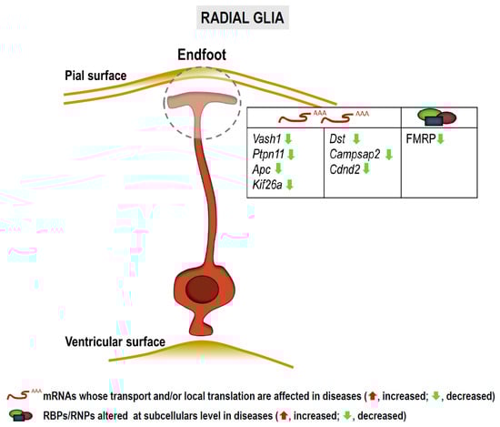 Transcripts and RBPs localized to subcellular compartments in radial glia potentially involved in neurological and neurodegenerative diseases. Arrows indicate altered levels (green, decrease) of mRNAs and/or proteins.