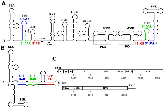 Flaviviruses contain single-stranded (+)-sense RNA genomes approximately 11 kilobases (kb) in length, with a single open reading frame encoding a genomic polyprotein that is post-translationally processed into its constituent parts. These genomes encode three structural proteins at the 5′ end, namely the capsid (C), precursor membrane, and the envelope protein, plus seven nonstructural proteins (detailed ahead). All flavivirus genomes include a short 5′ untranslated region (UTR) of approximately 100 nucleotides (nt) and a variable-length 3′ UTR containing a number of crucial RNA motifs broadly conserved across the family. As shown in Figure 1A, these motifs comprise a 5′ stem loop (SLA), a short hairpin (SLB), a capsid hairpin (cHP) at the 5′ end, and at the 3′ end of the genome frequently two dumbbell structures (5′ and 3′ DB) upstream of a terminal 3′ stem loop (3′ SL), and another short hairpin (sHP, also referred to as a “small stem loop” or SSL by some authors), which is preceded in sequence by a variable combination of stem-loops (SL), from 1 to 4 (SL-I to SL-IV), at the 5′ end of the 3′ UTR. In addition to these structures in the 5′ and 3′ regions, recent large-scale structure probing and crosslinking studies of DENV and ZIKV revealed a variety of conserved structural elements throughout the coding region, and functional experiments have demonstrated their importance for viral fitness [18,19,20]. In Figure 1, key elements are identified within a simplified graphical linear schematic of flaviviruses genomes. Overall, the flavivirus genome is relatively rich in conserved nucleotide sequences integrated into a variety of functional secondary structure elements with important roles in regulation and viral replication. The following section presents major functional regions individually and describes their particular structural characteristics.