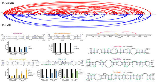 Figure 2. Internal circularization sites of DENV-1 genome, as determined by SPLASH cross-linking [19]. It is apparent that the number of internal circularization motifs in virions (red) is much higher than those identified in infected cells. A number of interactions persist in cells (blue). This may be attributed to the spatial constraints imposed by the virion shell or it may be a prerequisite for packaging. Functional assays demonstrate the importance of these motifs for viral fitness, with structure-disrupting changes causing a pronounced drop in viral activity. Compensatory mutations restore viral fitness. Several of the identified internal circularization sites show multiple interaction partners in the SPLASH experiment and structure models of the relevant regions show competing base pairs among the possible partners. It is currently unclear whether these competing interactions form in a stochastic manner or whether specific interactions are present at different stages of the viral life cycle and/or rearrange dynamically.