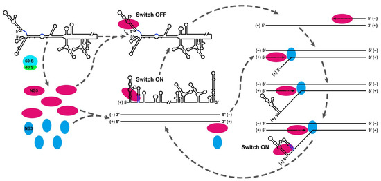 Figure 3. Schematic model elucidating the functional mechanism of the UAR-flanking stem (UFS) switch. Genome cyclization is crucial for the non-structural protein 5 (NS5) translocation to the RNA synthesis initiation site. Adapted with permission from [66].