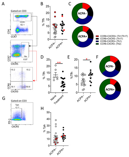 Increased Tfh cell frequency in ACPA+ compared to ACPA− RA patients undergoing treatment. (A) Representative flow cytometric analysis for the identification of Tfh cells (CXCR5+CD4+) and subsequent characterisation of CCR6+CXCR3+ (Th1/Th17-like Tfh), CCR6+CXCR3− (Th17-like Tfh), CCR6−CXCR3+ (Th1-like Tfh) and CCR6−CXCR3− (Th2 like Tfh), cells. (B) Cumulative data on the Tfh cell frequency of APCA− and APCA+ RA patients, samples in red indicate treatment naïve patients. (C) Tfh distribution to the indicated subpopulations. (D) Frequency of Tfh cells in treatment naïve compared to treated ACPA− RA patients. (E,F) comparison of total Tfh and subpopulation distribution between ACPA− and ACPA+ RA patients following exclusion of naïve to treatment patients. (G,H) Representative flow cytometric analysis for the identification of Tph cells (CD4+PD-1+CXCR5−) and peripheral blood Tph frequency of ACPA− and ACPA+ RA patients. Data are presented as mean ± SEM, symbols represent individual samples. Statistical analysis was performed by using two-tailed Mann-Whitney test, p < 0.05 * were considered significant, (p < 0.01 **).