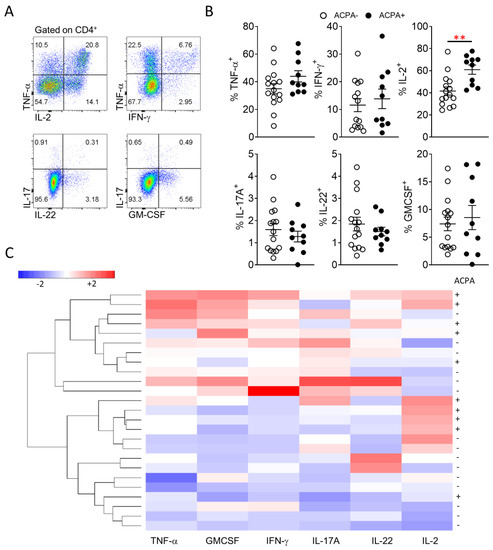 Several studies have previously indicated differential cytokine responses between ACPA+ and ACPA− RA patients, however results have been contradicting or lacking extensive direct description of proinflammatory T cell cytokine secretion [10,14,26]. While there is conflicting evidence regarding ACPA status and response to therapy, the comparative analysis of peripheral blood and importantly, synovial tissue T cell cytokine responses of ACPA− and ACPA+ RA patients, might allow the development of RA endotype specific treatment strategies [27]. Therefore, characterisation of T cell proinflammatory cytokine (TNF-α, IFN-γ, IL-2, IL-17A, IL-22, GM-CSF) expression was performed for peripheral blood and importantly synovial tissue CD4 T cells (Figure 4 and Figure 5). In peripheral blood, ACPA+ RA CD4 T cells showed significantly (** p = 0.003) higher expression of IL-2 and increased TNF-α compared to ACPA− RA patient CD4 T cells (Figure 4A,B). Unsupervised hierarchical clustering analysis of flow cytometric data, did not lead to a clear demarcation of ACPA− and ACPA+ RA peripheral blood CD4 T cell responses, indicative of a similar cytokine profile (Figure 4C).