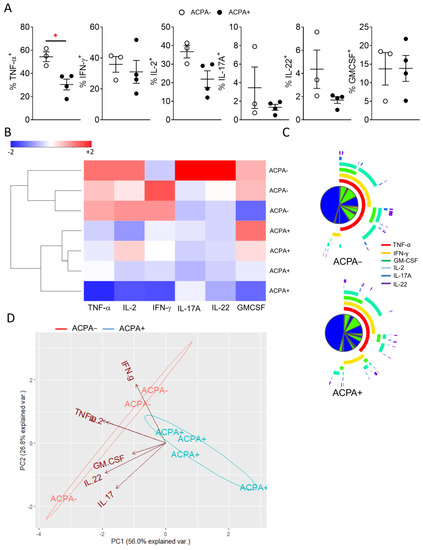 Distinct synovial tissue proinflammatory cytokine response profile for ACPA− compared to ACPA+ RA patients. (A) Cumulative data for the CD4+ T cell frequency of the indicated proinflammatory cytokines for ACPA− (n = 3) and ACPA+ (n = 4) RA patients (B) Hierarchical clustering of ACPA− and ACPA+ RA patients based on scaled frequency of CD4+ T cell cytokine production. (C) SPICE analysis of flow cytometric data for the identification of polyfunctional ACPA− and ACPA+ RA patient synovial tissue CD4+ T cells. (D) Biplot of PCA analysis on scaled flow cytometric data. Arrows indicate variable direction, ACPA− and ACPA+ RA patient synovial tissue CD4+ T cells cluster in 2 distinct groups as indicated by elliptical lines. Data are presented as mean ± SEM, symbols represent individual samples. Statistical analysis was performed by using two-tailed Students t test, p < 0.05 * were considered significant.
