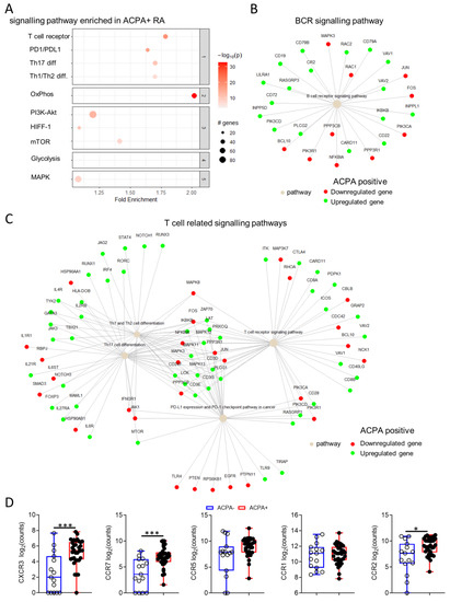 Of 19484 genes detected, 6198 (32%) were differentially expressed between ACPA− and APCA+ RA patient synovial tissue, with 4967 of them having known interactions (Figure 6 and Figure S4A). Pathway enrichment analysis was performed based on differentially expressed genes with an adjusted p value below 0.01 using a protein-protein interaction subnetwork analysis approach (pathfindeR in R) and the latest KEGG database [28,29]. Pathway enrichment returned a total of 194 pathways with significant differences in fold enrichment scores. Selected pathways with previously known involvement in RA pathogenesis are shown (Figure 6). Interestingly, increased enrichment of the OxPhos (Fold enrichment = 2.02) pathway and only a minor enrichment of the Glycolysis/Gluconeogenesis (Fold enrichment = 1.1) pathway was observed in ACPA+ compared to ACPA− RA (Figure 6A). The B cell receptor pathway and key T cell related pathways including the TCR signaling pathway were significantly enriched, a breakdown of the up- or downregulation of the genes involved in these pathways are shown (Figure 6B,C). Interestingly, differences were observed in the usage of chemokine receptors with significantly increased expression of CXCR3, CCR7 and CCR2 (* p = 0.004, ** p < 0.003 and * p = 0.04, respectively) in ACPA+ compared to ACPA− RA, highlighting potentially fundamental differences in immune cell recruitment between for the two endotypes of disease (Figure 6D).