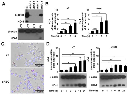 Phagocytosis of apoptotic cells induces the expression of heme oxygenase-1 (HO-1) in engulfing macrophages. (A) Lack of detectable HO-1 expression in apoptotic thymocytes (aT) and eryptotic red blood cells (eRBCs) determined by Western blot analysis. β-actin was used as a loading control. MΦ, macrophage. (B) Representative fluorescent microscopic images of macrophages engulfing apoptotic thymocytes or eryptotic RBCs. Scale 50 µm. (C) Induction of HO-1 expression at mRNA levels in engulfing macrophages exposed to either apoptotic thymocytes or to eryptotic RBCs for the indicated time periods. mRNA expressions were determined by qRT-PCR using cyclophilin as a normalizing gene. Data are fold expressions as compared to the basal HO-1 mRNA expressions in non-engulfing macrophages. (D) Induction of HO-1 protein levels in engulfing macrophages exposed to apoptotic thymocytes or eryptotic RBCs for the indicated time periods. Protein levels were determined by Western blot analysis using β-actin as a loading control. One representative Western blot is shown. Data are fold expressions as compared to the basal HO-1 protein expressions in non-engulfing macrophages. Data represent mean ± S.D. (n = 3) * p < 0.05, ** p < 0.01, *** p < 0.001, **** p < 0.0001.