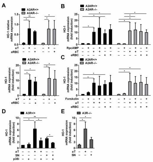 Adenosine is not involved in the induction of HO-1 expression in bone marrow-derived macrophages engulfing apoptotic cells. (A) There is no difference in the basal or in the induced HO-1 mRNA expressions in A2AR−/− macrophages as compared to the A2AR+/+ macrophages engulfing either apoptotic thymocytes or eryptotic RBCs. Data in the left figure represent relative gene expressions, while those in the right figure represent folds of the non-engulfing A2AR+/+ macrophages. (B) RpcAMP, a competitive inhibitor of cAMP, added in 100 μM concentration does not affect the basal or the dying cell uptake-induced mRNA expressions of HO-1 in A2AR+/+ and A2AR−/− macrophages. Data are expressed as fold of the non-engulfing A2AR+/+ macrophages. (C) Forskolin, an adenylate cyclase activator, added in 10 μM concentration does not affect either the basal or the dying cell uptake-induced mRNA expressions of HO-1 in A2AR+/+ and A2AR−/− macrophages. All cultures contained 0.1 v/v% DMSO, which is the solvent of the activator. Data are expressed as fold of the non-engulfing A2AR+/+ macrophages. (D) SB203580, a p38 MAP kinase inhibitor, added in 10 μM concentration, inhibits both the apoptotic thymocyte- and the apoptotic thymocyte supernatant (SN)-induced HO-1 mRNA expressions in A3R+/+ macrophages. All cultures contained 0.1 v/v% DMSO, which is the solvent of the inhibitor. Data are expressed as fold of the non-engulfing A3R+/+ macrophages. (E) The loss of A3Rs does not influence the apoptotic thymocyte- or the apoptotic thymocyte supernatant-induced HO-1 mRNA expressions detected at 6 h. Data are expressed as fold of the non-engulfing A3R+/+ macrophages. mRNA expressions were determined after 6 h phagocytosis or compound exposure by qRT-PCR using cyclophilin A as a normalizing gene. Data represent mean ± S.D. (n = 3) * p < 0.05, ** p < 0.01.