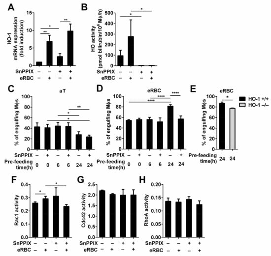 Signaling pathways initiated by the phagocytic receptors were reported to regulate the GTP loading of several small G proteins to achieve efficient efferocytosis. Thus, the activation of Rac1 and Cdc42 was shown to be required for efferocytosis [55,56], while the activation of RhoA was reported to be inhibitory [57]. Later, using Forster resonance energy transfer biosensors, it was discovered that these small G proteins work in a temporally regulated fashion in which Rac1 and Cdc42 are activated early to work together in facilitating phagocytic cup formation through actin polymerization followed by RhoA activation, which drives mechanical retraction and phagosome internalization [58]. Thus, we decided to determine the general activity of these three G proteins following the 24 h phagocytosis of RBCs in wild-type macrophages exposed or not to SnPPIX. As shown in Figure 4G,H, we found an increase in the amount of activated Rac1 and no alterations in the amount of activated RhoA and Cdc42 after 24 h of RBC efferocytosis. The inhibitor alone did not affect the activity of these G proteins. However, in the presence of the inhibitor, the phagocytosis-induced activation of Rac1 was prevented. Our findings could not confirm the results of a report that indicated that the accumulation of heme in macrophages (in their case during hemolysis) can overactivate Cdc42 by binding to its guanine nucleotide exchange factor dedicated of cytokinesis 8 (DOCK8) [59]. Our data indicate rather that in the absence of HO-1 activity, Rac1 activation is influenced during phagocytosis. Since previous studies demonstrated that carbon monoxide, the product of HO activity, promotes efferocytosis [60], our data might indicate that at physiological levels of heme uptake, the accumulation of heme and loss of production of carbon monoxide together might affect long-term efferocytosis in the absence of HO activity influencing dominantly Rac1 activity.