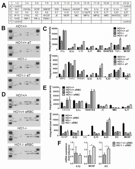 Evaluation of the cytokine secretion profile of unstimulated macrophages was performed using a highly sensitive cytokine antibody array method, enabling the simultaneous detection of low concentrations of multiple cytokines in one assay (picogram per milliliter range). The map of the 40 cytokines detected on the membranes is diagrammed in Figure 5A. The cytokines released were first evaluated by experiments using untreated wild-type and HO-1 null macrophages in vitro. The results reported in Figure 5B–E from non-engulfing macrophages show that most of the available cytokines on the filters were detectable, even though some were at very low levels. The loss of HO-1 did not affect significantly the composition of most of the cytokines released, but we found great individual differences in the amount of pro-inflammatory cytokines produced both within the HO-1+/+ and HO-1−/− macrophages derived from different mice. However, as summarized in Figure 5C,E, when macrophages were exposed to either apoptotic thymocytes or eryptotic RBCs, we found several cytokines, the production of which was suppressed in wild-type engulfing macrophages, but increased or remained unaltered in their HO-1 null counterparts. Nine of these cytokines (IL-1α and β, IL-17, monokine induced by gamma (MIG), regulated on activation, normal T cell expressed and secreted (RANTES), MCSF, IL-13, IL-23, keratinocyte chemoattractant, (KC)) highlighted with bold in Figure 5C,E were identified during both thymocyte and RBC phagocytosis as pro-inflammatory cytokines, the downregulation of which was affected by the loss of HO-1 in three independent experiments. Interestingly, we found the IL-1R antagonist to respond in a similar manner, not only in this study, but also in a previous study [10], which is in line with the observation that IL-1 production and activity are regulated separately, and an innate memory might also influence IL-1 action [61].