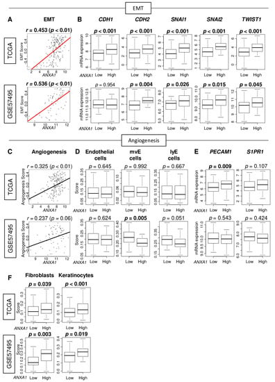 Association of Annexin A1 (ANXA1) expression with epithelial–mesenchymal transition (EMT), angiogenesis, and stromal cells in The Cancer Genome Atlas (TCGA) and GSE57495 cohorts. (A) Scatter plots of ANXA1 expression with the EMT score. (B) Boxplots of EMT-associated gene expression: cadherin1 (CDH1) and CDH2, snail family transcriptional repressor 1 (SNAI1) and SNAI2, and twist-related protein 1 (TWIST1) by ANXA1 low and ALXA1 high pancreatic cancer (PC). (C) Scatter plots of ANXA1 expression with the angiogenesis score. (D) Boxplots of infiltrating fraction of endothelial cells, microvascular endothelial (mvE) cells, and lymphatic endothelial (lyE) cells by ANXA1 low and ANXA1 high PC. (E) Boxplots of angiogenesis-associated genes expression: platelet and endothelial cell adhesion molecule 1 (PECAM1) and sphingosine-1-phosphate receptor 1 (S1PR1) by ANXA1 low and ANXA1 high PC. (F) Boxplots of the infiltrating fraction of fibroblasts and keratinocytes by ANXA1 low and ANXA1 high PC. Median cut-off within each cohort was used to divide them into ANXA1 low and ANXA1 high groups (n = 88, respectively, in the TCGA and n = 31 and 32, respectively, in the GSE57495 cohort). Spearman’s rank correlation was used for the correlation analysis. For group comparison, p-values were calculated by the Mann–Whitney U test.