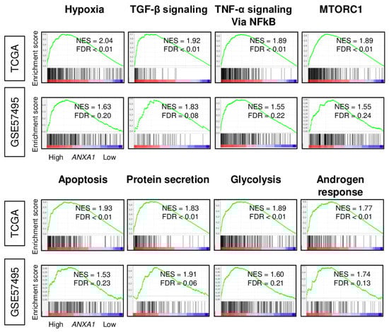 To better understand the functional characteristics of ANXA1 high PC, we performed a pathway analysis using the Gene Set Enrichment Analysis (GSEA) with Hallmark gene sets in the TCGA and GSE57495 cohorts. In both cohorts, ANXA1 high PC consistently enriched multiple malignant pathways such as hypoxia, transforming growth factor (TGF)-β signaling, TNF-α signaling via nuclear factor-kappa B (NF-kB), and MTORC1, as well as apoptosis, protein secretion, glycolysis, and the androgen response (Figure 2; all gene sets; normalized enrichment score (NES) > 1.5, false discovery rate (FDR) < 0.25). These results suggest that ANXA1 high PC is associated with EMT and other malignant pathways in PC.