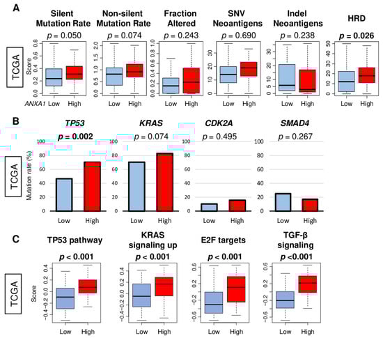 The association of ANXA1 with gene mutation and homologous recombination deficiency (HRD) in the TCGA pancreatic cancer cohort. (A) Bar plots of the mutation rate of KRAS, TP53, CDK2A, and SMAD4 by ANXA1 low and ANXA1 high groups. p-values were calculated with Fisher’s exact test. (B) Boxplots of the mutation-related scores, including altered fraction, single nucleotide variant (SNV) and indel neoantigens, and silent and non-silent mutations, and (C) HRD scores by ANXA1 low (blue) and ANXA1 high (red) groups. Median cut-off was used to divide into ANXA1 low and ANXA1 high groups (n = 88, respectively). p-values were calculated by the Mann–Whitney U test.