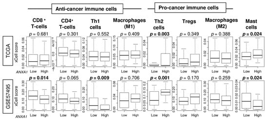 We reported that ANXA1 high breast cancer is associated with a high infiltration of mast cells [15]. Therefore, we wanted to investigate whether similar immune cell infiltration is seen in ANXA1 high PC. The xCell algorithm was used to estimate the fraction of immune cells in the tumor microenvironment of PC in the TCGA and GSE57495 cohorts. We found that ANXA1 high PC was significantly associated with a high infiltration of Th2 cells consistently in both the TCGA and GSE57495 cohorts (Figure 4; p = 0.003 and p < 0.001, respectively). Interestingly, ANXA1 high PC was associated with a high infiltration of mast cells in the TCGA; however, it was associated with a low infiltration in the GSE57495 cohort. Furthermore, ANXA1 high PC was associated with a low infiltration of CD8+ T cells and Th1 cells in the GSE57495 cohort but not in the TCGA. These findings suggest that a high expression of ANXA1 is associated with a high infiltration of Th2 cells in PC.