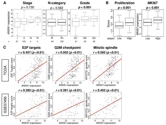 Association of the ANXA1 expression and tumor aggressiveness in PC. Boxplots of (A) the clinical factors: AJCC stage, N-category, and histological grade and (B) proliferation-related factors: proliferation score and MKI67 expression in the TCGA cohort. p-values were calculated by the Kruskal–Wallis and Mann–Whitney U tests. (C) Correlation plots between the ANXA1 expression and cell proliferation-related score: E2F targets, G2M checkpoint, and Mitotic spindle score in the TCGA and GSE57495 cohorts. The median cut-off was used to divide them into the ANXA1 low and ANXA1 high groups (n = 88, respectively). Spearman’s rank correlation was used for the analysis. AJCC: American Joint Committee on Cancer.