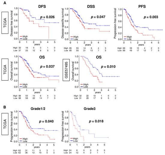 Association of the ANXA1 expression with patient survival in the TCGA and GSE57495 cohorts. (A) Kaplan–Meier curve between low (blue line) and high (red line) with disease-free survival (DFS), disease-specific survival (DSS), progression-free survival (PFS), and overall survival (OS). The median cut-off within each cohort was used to divide them into the ANXA1 low and ANXA1 high groups (n = 88, respectively, in the TCGA and n = 31 and 32, respectively, in the GSE57495 cohort). (B) Kaplan–Meier curve between low and high with PFS in the pathological grades 1/2 (n = 62, respectively) and grade 3 groups (n = 24, respectively) in the TCGA cohort. p-values were calculated by log-rank test.