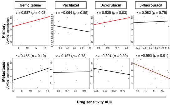 Correlation of the ANXA1 expression with the drug sensitivity of several drugs in primary and metastasis PC cell lines. The correlation plots of the ANXA1 expression with the level of drug sensitivity area under the curve (AUC) of gemcitabine, paclitaxel, doxorubicin, and 5-fluorouracil. Spearman’s rank correlation coefficient was used for the analysis.
