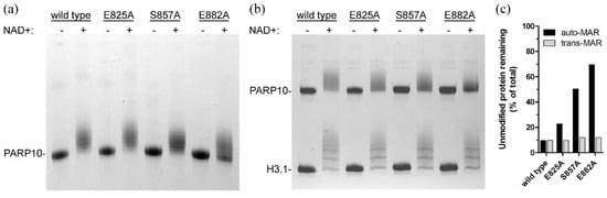 Because E825 appeared to emerge as a prominent target residue for PARP10 auto-MARylation, it was interesting to use AU-PAGE to examine the function of this residue further. We generated the mutants E825A, S857A, and E882A of PARP10819–1007 and then tested their auto-MARylation products by AU-PAGE (Figure 3). All three mutations resulted in a mild reduction in the number of up-shifted protein bands (Figure 3a). This reduction was the most prominent for E882A, in which case some unmodified PARP10 clearly remained after incubation with NAD+ for 1 h. This is also similar to a previous observation using the same mutation []. We reasoned that a reduction in mobility of the E882A protein might be caused by either the loss of a prominent acceptor residue, or by kinetic consequences owing to the loss of this residue. To discriminate between these two possibilities, we analyzed trans-MARylation of histone H3.1 (Figure 3b). The result showed that all four proteins were equally able to induce a band pattern in H3.1. We conclude that E882 is a prominent target residue for auto-MARylation; but under our in vitro conditions, auto-MARylation of neither E825, S857, nor E882 has a direct regulatory function in the catalytic activity of PARP10.