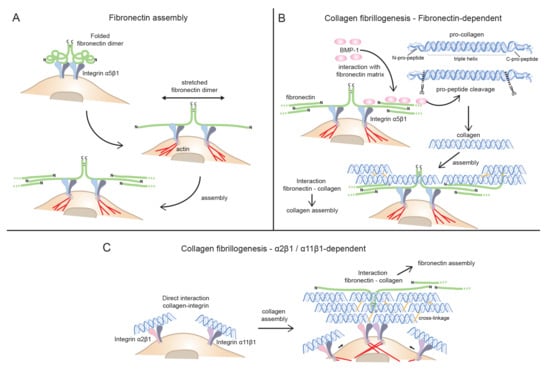 Collagen and fibronectin fibrillogenesis. (A) Fibronectin fibrillogenesis. Binding of fibronectin (FN) to the FN receptor α5β1 integrin leads to a conformational change in FN exposing sites needed for fibril formation. The actin cytoskeleton exerts a pulling force on α5β1 integrins to unfold FN. (B) Indirect mode of collagen assembly (fibronectin-dependent). Fibrillar collagens are secreted as pro-collagen. FN facilitates collagen assembly by concentrating BMP-1, which is involved in collagen pro-peptide cleavage. Collagen could then interact with FN matrix that serves as nucleator of collagen assembly. (C) Direct mode of collagen assembly (collagen-binding, integrin-dependent). The collagen-binding integrins α2β1 and α11β1 directly interact with collagen. They have been suggested to assist in collagen assembly. The FN and collagen matrix assembly are closely linked. These integrins might have a central role in the conditions where FN assembly is dependent on collagen fibrillogenesis.