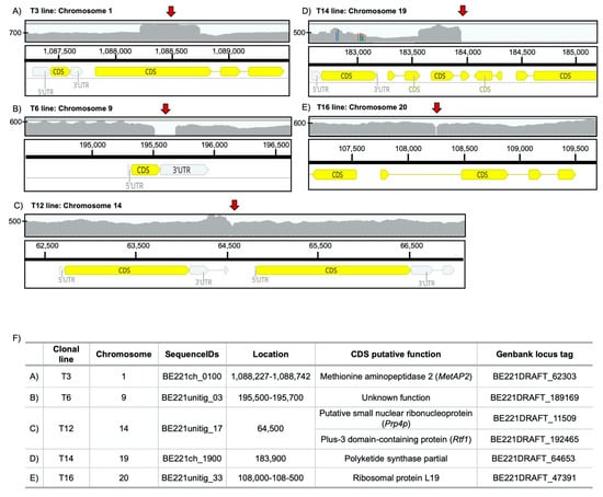 IGV (Integrative Genomics Viewer) visualization of read coverage and identification of insertion sites. Genomic maps of the vector-insertion site in (A) T3, (B) T6, (C) T12, (D) T14 and (E) T16 transformed clonal lines. The coverage plot is shown in the top panel (Y-axis the coverage (X) scale), the locations of insertion sites are shown with red arrows and the gene annotation of the reference genome is shown in the bottom panel. (F) Exact location of the sites of vector integration and putative functions of genes surrounding the insertion site.