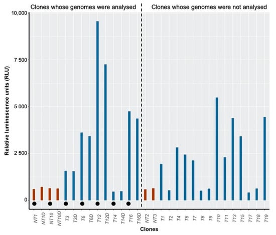 Firefly luciferase assay of transgenic clonal lines. Emission of light measured expressed in relative luminescence units (RLU) from 19 transformed clonal lines (blue bars) and 4 untransformed clonal lines as a control (red bars). The stability of the vector within the host genome was analyzed in the 7 lines studied in this study by measuring the fluorescence emitted from samples (NT1D, NT10D, T3D, T6D, T12D, T14D, T16D) thawed 6 months after transformation. Clonal lines studied in this work are distinguished by filled black circles. Raw data are available in Table S4. Each sample was measured once.