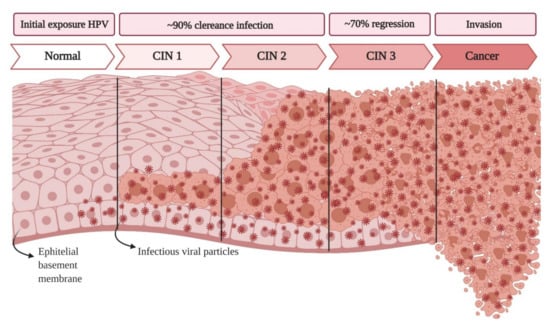The fundamental step in the malignant transformation of cervical cells is the interaction between these cells and HPV [15,16]. This infection can originate pre-neoplastic lesions [17], known as cervical intraepithelial neoplasia (CIN) (Figure 1). Based on their association with cervical cancer and precursor lesions, HPVs can also be grouped into high-risk and low-risk HPV types. Low-risk HPV types are those that cause genital warts but are not carcinogenic, including types 6, 11, 42, 43, and 44 [16,18]. High-risk HPV types are considered carcinogenic, and include 16, 18, 31, 33, 34, 35, 39, 45, 51, 52, 56, 58, 59, 66, 68, and 70 [6,16].