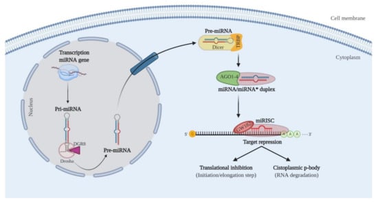 miRNAs are small non-coding RNAs (19 to 24 nucleotides) that regulate the expression of coding genes [24] with crucial roles in important biological processes, such as proliferation, cell growth, and apoptosis, among others [25,26]. The canonical pathway of biogenesis of miRNAs begins in the nucleus after the transcription of the miRNA by polymerase II—the synthesis of the primary miRNA (Pri-miRNA). Then, the Drosha enzyme linked to the DGCR8 cofactor cleaves the end of the poly AAA tail, giving rise to the precursor miRNA (Pre-miRNA), which is exported to the cytoplasm via exportin 5. In the cytoplasm, the Pre-miRNA clamp is cleaved by Dicer enzyme linked to the TRBP cofactor resulting in a duplex miRNA, at which point the RISC complex guides only one of the strands of mature miRNA to the target mRNA. Then, the interaction in the 3’UTR region occurs [27]. The result of the interaction between the mRNA and the miRNA can lead to inhibition of translation, in the event of imperfect pairing, or the degradation of the mRNA, which occurs in cases of perfect pairing between the miRNA and the mRNA [28] (Figure 2).