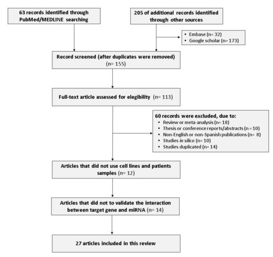 We employed the PICO acronym (participants, interventions, comparisons, outcomes) for predetermined criteria for inclusion [38,40]; the criteria can be seen in Table 1. All miRNAs involved with cervical cancer studies were used in the present study if they met the following criteria: (i) original experimental report to analyze miRNA profile between human cancerous and noncancerous cervical tissues and/or CIN; (ii) articles published in the last 10 years; (iii) original articles published in either English or Spanish; and (iv) impact factor greater than or equal to 2. The exclusion criteria were as follows: (i) articles entirely in silico; (ii) an article that belongs to a meta-analysis, thesis, series, abstract, comment, review, letter, or editorial; (iii) duplicate reports; (iv) studies that did not have control tissues and studies that did not use human samples; (v) articles that did not use cell lines and patients’ samples; (vi) studies that did not to validate the interaction between the target gene and miRNA.