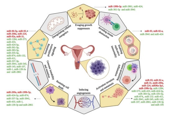 Different miRNAs affecting the hallmarks of cervical cancer.